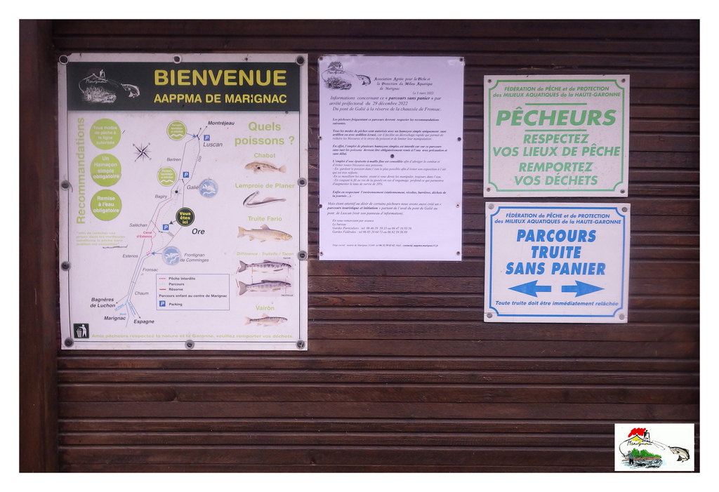 Nous avons créé depuis 2015 un « parcours touristique et initiation » partant du pont de Luscan au pont de Galié ainsi qu’un « parcours sans panier » ou la pêche est autorisée uniquement à l’aide d’un hameçon simple sans ardillon ou ardillon écrasé , partant du pont de Galié à la réserve de la Chaussée de Fronsac dont les informations sont sur les panneaux en bois situés à chaque pont. Sur ces panneaux , vous pourrez trouver toute la réglementation à appliquer pour votre partie de pêche ainsi qu’un Plan que vous pouvez consulter en cliquant ici